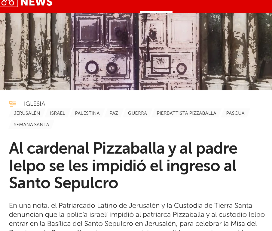 In einer Erklärung verurteilten das Lateinische Patriarchat von Jerusalem und die Kustodie des Heiligen Landes die israelische Polizei dafür, dass sie Patriarch Pizzaballa und Kustos Ielpo den Zutritt zur Grabeskirche in Jerusalem zur Feier der Palmsonntagsmesse verweigerte. „Zum ersten Mal seit Jahrhunderten: eine schwerwiegende und unangemessene Maßnahme, ein Verstoß gegen die Grundsätze der Religionsfreiheit und der Achtung des Status quo.“