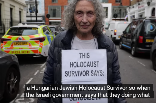 Diese ungarische Jüdin ist eine Überlebende des Holocausts. Sie demonstriert hier in London gegen die terroristische israelische Regierung