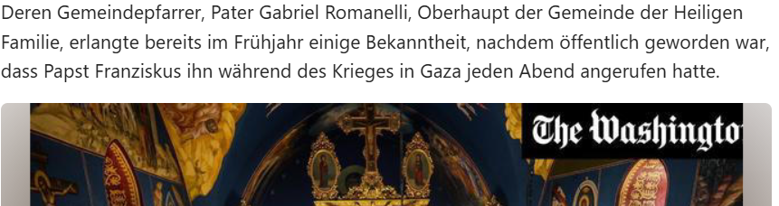 Ein Anruf der Hoffnung verbreiten sollte und es wahrscheinlich auch gemacht hat. Der Anruf hatte noch eine andere Funktion. Er beschützte alle, die sich in der Kirche befanden vor terroristischen Mördern. Meiner Meinung der Mordanschlag vom 17.juli kein Zufall sondern ein Test Ein test auch für Papst Leo. Er möchte wissen wie wchtig Gaza für diesen Papst ist ermeint mit jesus von Nazareth